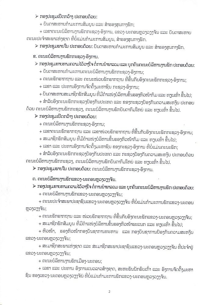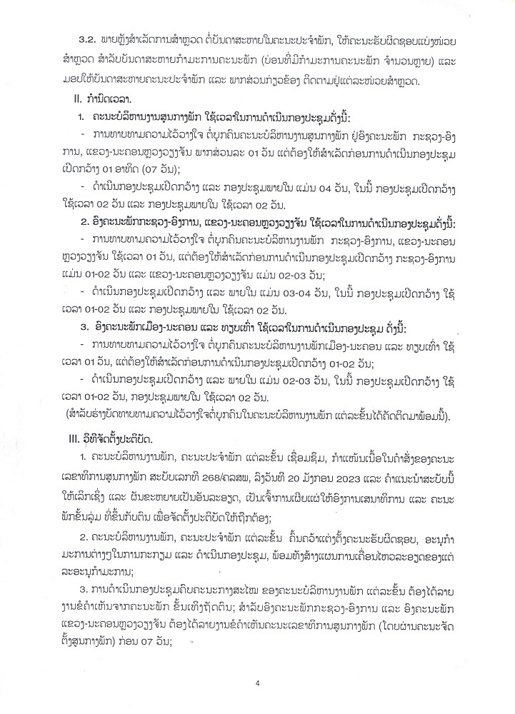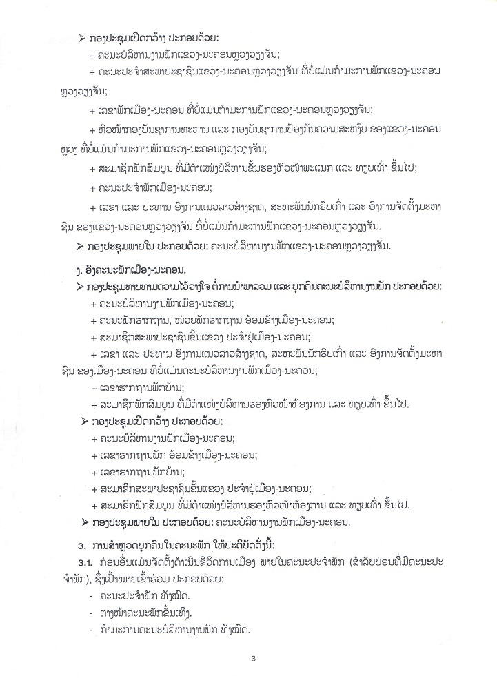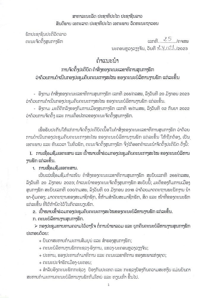 ຄຳແນະນຳ ເລທີ 25/ຄຈສພ ວ່າດວ້ຍການຈັດຕັ້ງປະຕິບັດ ຄຳສັ່ງຂອງຄະນະເລຂາທິການສູນກາງພັກ ວ່າດ້ວຍການດຳເນີນກອງປະຊຸມຄົບຄະນະກາງສະໄໝ ຂອງຄະນະບໍລິຫານງານພັກ ແຕ່ລະຂັ້ນ