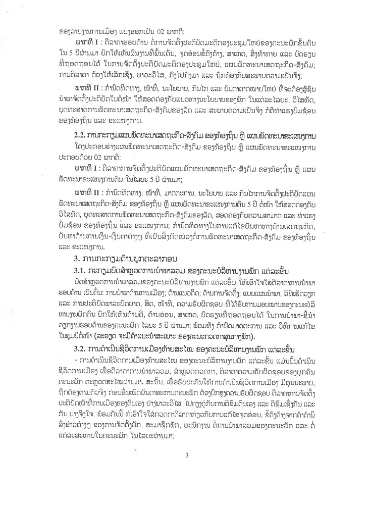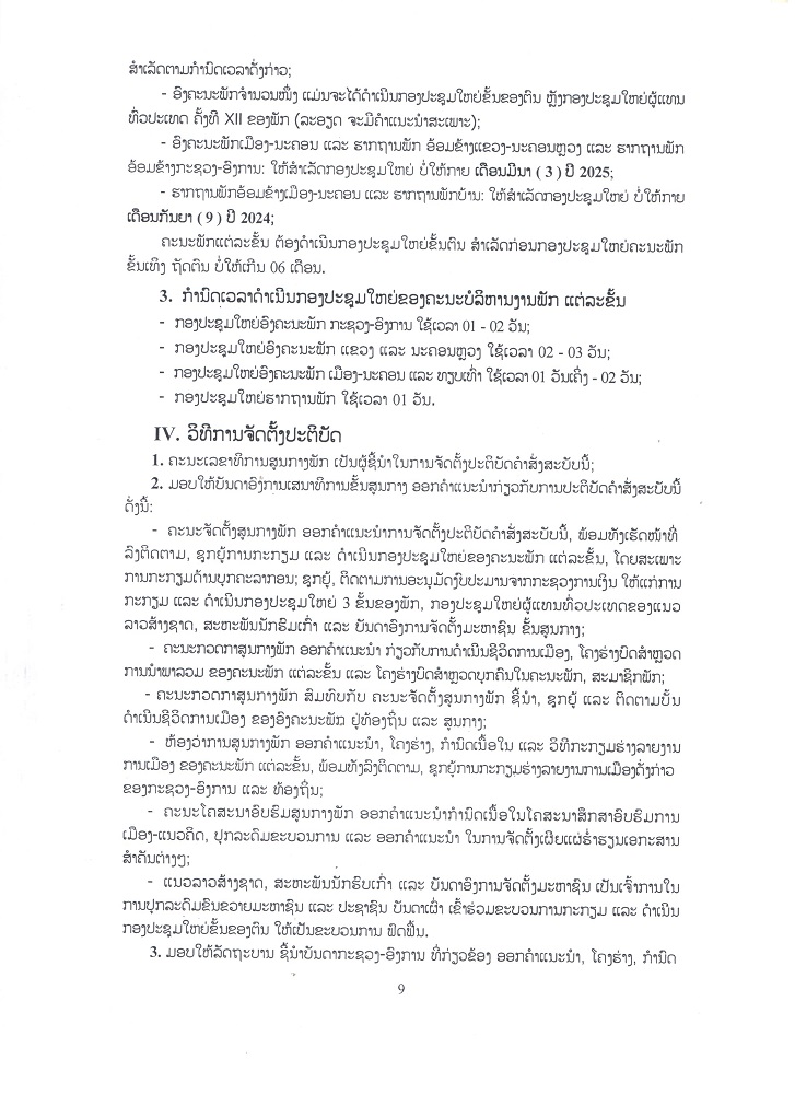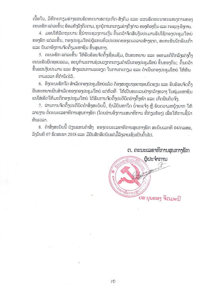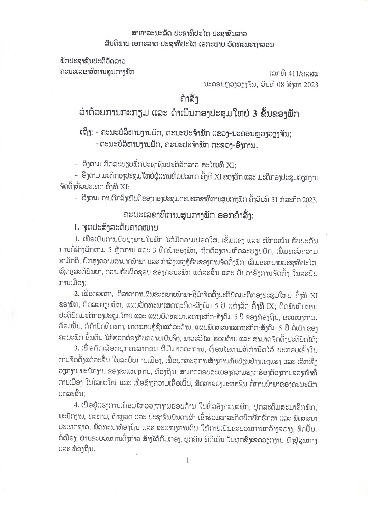 ຄຳສັ່ງເລກທີ 411/ຄລສພ ລົງວັນທີ 8 ສິງຫາ 2023 ວ່າດ້ວຍການກະກຽມ ແລະ ດຳເນີນກອງປະຊຸມໃຫຍ່ 3 ຂັ້ນຂອງພັກ