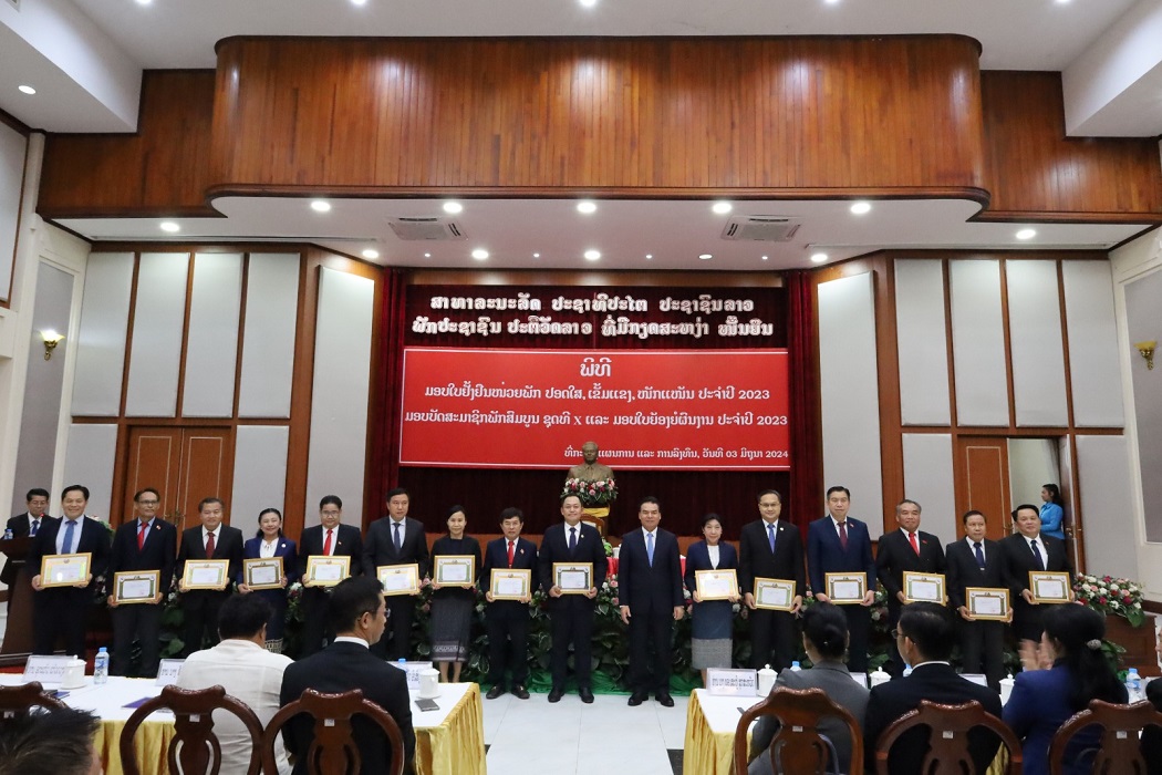 ໃນຕອນທ້າຍ, ສະຫາຍ ປອ. ເພັດ ພົມພີພັກ ໄດ້ໃຫ້ກຽດມອບໃບຢັ້ງຢືນໜ່ວຍພັກປອດໃສ, ເຂັ້ມແຂງ, ໜັກແໜ້ນ ໃຫ້ແກ່ 15 ໜ່ວຍພັກ ແລະ ມອບໃບຍ້ອງຍໍໃຫ້ແກ່ກົມກອງ, ບຸກຄົນທີ່ມີຜົນງານດີເດັ່ນໃນຕະຫຼອດໄລຍະປີ 2023 ລວມທັງໝົດ 627 ສະຫາຍ, ຍິງ 230 ສະຫາຍ, ໃນນີ້ ມີປະເພດໃບຍ້ອງຍໍ ຈໍານວນ 623 ສະຫາຍ, ຍິງ 229 ສະຫາຍ, ປະເພດໃບຊົມເຊີຍ ຈໍານວນ 04 ສະຫາຍ, ຍິງ 01 ສະຫາຍ; ພ້ອມນີ້ ສະຫາຍຍັງໄດ້ມີຄໍາເຫັນໂອ້ລົມສະແດງຄວາມຊົມເຊີຍຕໍ່ຜົນສໍາເລັດຂອງບັນດາໜ່ວຍພັກ ທີ່ສາມາດຮັກສາມູນເຊື້ອເປັນໜ່ວຍພັກ ປອດໃສ, ເຂັ້ມແຂງ, ໜັກແໜ້ນ ແລະ ມີທິດຊີ້ນໍາໃຫ້ລົງເລິກແຕ່ລະຄາດໝາຍສູ້ຊົນເປັນຕົ້ນ ດ້ານການເມືອງ, ແນວຄິດ, ການຈັດຕັ້ງ, ແບບແຜນວິທີການນໍາພາ ແລະ ການປະຕິບັດໜ້າທີ່ການເມືອງໃຫ້ເປັນປົກກະຕິ, ສືບຕໍ່ຕັ້ງໜ້າປະຕິບັດຄໍາຂວັນຂອງກອງປະຊຸມໃຫຍ່ ຄັ້ງທີ IV ຂອງອົງຄະນະພັກກະຊວງແຜນການ ແລະ ການລົງທຶນ “ເພີ່ມທະວີການນໍາພາ ວຽກງານແຜນການ ແລະ ການລົງທຶນ ໃຫ້ມີການຫັນປ່ຽນ ຢ່າງມີຈຸດສຸມ, ມີຄຸນນະພາບ ແລະ ທັນສະໄໝ”, ພ້ອມທັງປະຕິບັດໜ້າທີ່ວຽກງານວິຊາສະເພາະຂອງຕົນ ໃຫ້ມີຜົນສຳເລັດເປັນກ້າວໆ.
