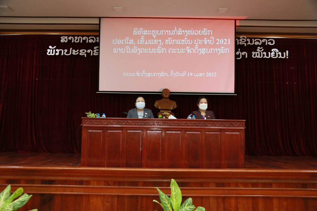 ໃນວັນທີ 19 ເມສາ 2022 ຢູ່ທີ່ຫ້ອງປະຊຸມໃຫຍ່ຄະນະຈັດຕັ້ງສູນກາງພັກ ໄດ້ຈັດກອງປະຊຸມສະຫຼຸບແຜນການກໍ່ສ້າງໜ່ວຍພັກປອດໃສ ເຂັ້ມແຂງ ໜັກແໜ້ນ ປະຈຳປີ 2021 ຂອງບັນດາໜ່ວຍພັກ ທີ່ຂຶ້ນກັບອົງຄະນະພັກ ຄະນະຈັດຕັ້ງສູນກາງພັກ ແລະ ປາຖະກະຖາວັນສ້າງຕັ້ງຄະນະຈັດຕັ້ງສູນກາງພັກ ຄົບຮອບ 67 ປີ (25/3/1955-25/3/2022) ໃຫ້ກຽດເຂົ້າຮ່ວມເປັນປະທານ ແລະ ມີຄຳເຫັນໂອ້ລົມຕໍ່ພິທີດັ່ງກ່າວໂດຍ ສະຫາຍ ນາງ ສີໃສ ລືເດດມູນສອນ ກໍາມະການກົມການເມືອງສູນກາງພັກ, ເລຂາທິການສູນກາງພັກ, ເລຂາຄະນະພັກ, ຫົວໜ້າຄະນະຈັດຕັ້ງສູນກາງພັກ, ມີ ສະຫາຍ ນາງ ບຸດສະດີ ທະນະເມືອງ ກຳມະການສູນກາງພັກ, ຮອງເລຂາຄະນະພັກ, ຮອງຫົວໜ້າຄະນະຈັດຕັ້ງສູນກາງພັກ, ມີຄະນະພັກ ຄຈສພ, ຄະນະໜ່ວຍພັກບັນດາກົມ ແລະ ສະມາຊິກພັກເຂົ້າຮ່ວມຢ່າງພ້ອມພຽງ.