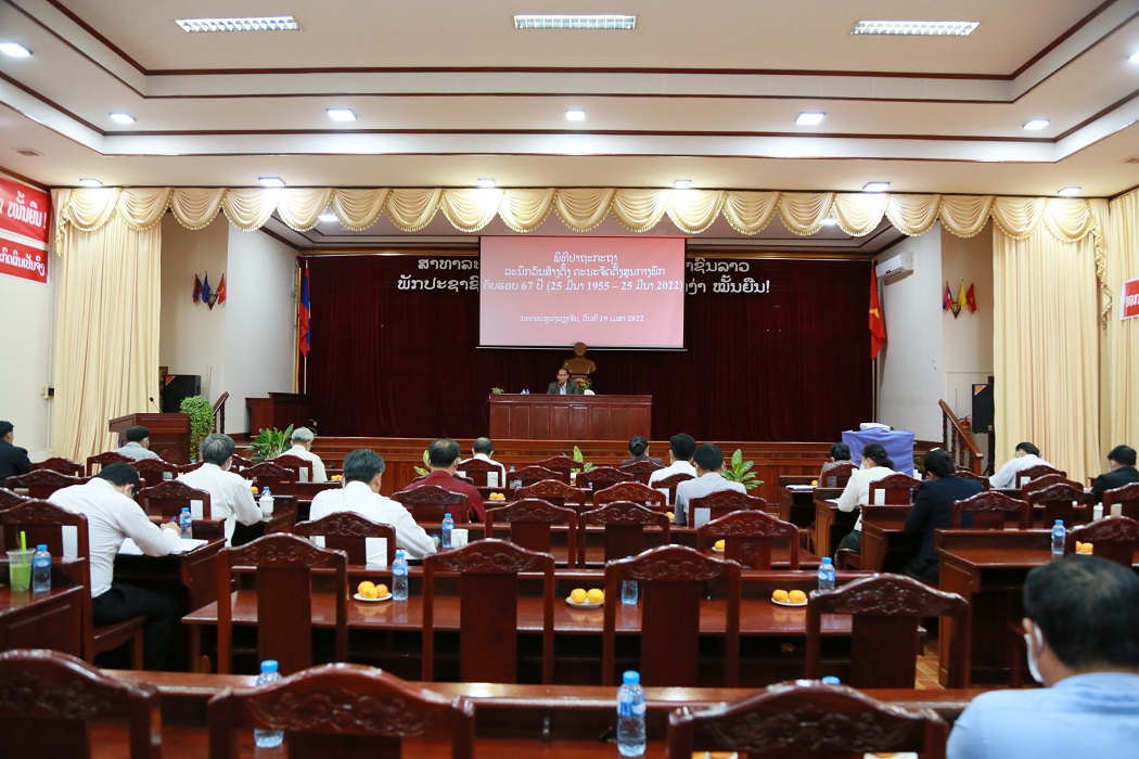 ໃນຕອນບ່າຍ, ໄດ້ຈັດປາຖະກະຖາວັນສ້າງຕັ້ງຄະນະຈັດຕັ້ງສູນກາງພັກ ຄົບຮອບ 67 ປີ (25/3/1955-25/3/2022), ໃຫ້ກຽດປາຖະກະຖາໂດຍ ສະຫາຍ ທອງຈັນ ໂຂງພູມຄຳ ຄະນະປະຈຳພັກ, ຮອງຫົວໜ້າຄະນະຈັດຕັ້ງສູນກາງພັກ, ເຊິ່ງໄດ້ຍົກໃຫ້ເຫັນເຖິງປະຫວັດແຫ່ງການກຳເນີດ, ເຕີບໃຫຍ່ຂະຫຍາຍຕົວຂອງຄະນະຈັດຕັ້ງສູນກາງພັກ; ພ້ອມນັ້ນ, ກໍໃຫ້ຮູ້ເຖິງຜົນງານທີ່ພົ້ນເດັ່ນ, ຂໍ້ຄົງຄ້າງ ແລະ ບົດຮຽນທີ່ຖອດຖອນໄດ້ໃນໄລຍະ 67 ປີຜ່ານມາ; ສະຫາຍ ຍັງໄດ້ເນັ້ນໜັກບາງບັນຫາທີ່ຕ້ອງໄດ້ເອົາໃຈໃສ່ໃນຕໍ່ໜ້າ ເປັນຕົ້ນແມ່ນ ພະນັກງານຈັດຕັ້ງຕ້ອງເຫັນໄດ້ຄວາມສຳຄັນຂອງວຽກງານຈັດຕັ້ງ, ກໍ່ສ້າງພັກ-ພະນັກງານ, ກຳໄດ້ພາລະບົດບາດ, ສິດ, ໜ້າທີ່ຂອງຕົນ ແລະ ຕັ້ງໜ້າປະຕິບັດໜ້າທີ່ ທີ່ຕົນຮັບຜິດຊອບຢ່າງມີປະສິດຕິຜົນ. ເພື່ອຮັກສາມູນເຊື້ອ ແລະ ຜົນງານອັນໃຫຍ່ຫລວງທີ່ຄະນະຈັດຕັ້ງສູນກາງພັກຍາດມາໄດ້ນັ້ນ, ຮຽກຮ້ອງໃຫ້ພະນັກງານທຸກຄົນ-ສະມາຊິກພັກທຸກສະຫາຍ ຈົ່ງພ້ອມກັນຕັ້ງໜ້າຝຶກຝົນຫລໍ່ຫລອມຕົນເອງໃນທຸກດ້ານ ໂດຍສະເພາະຕ້ອງຍຶດໝັ້ນຈັນຍາບັນ, ຈັນຍາທຳ ຂອງພະນັກງານຈັດຕັ້ງ ເພື່ອສືບຕໍ່ເຮັດພາລະກິດປະຕິວັດທີ່ການນຳຮຸ່ນກ່ອນໄດ້ສ້າງໄວ້ໃຫ້ໝັ້ນຄົງຕະຫລອດໄປ.