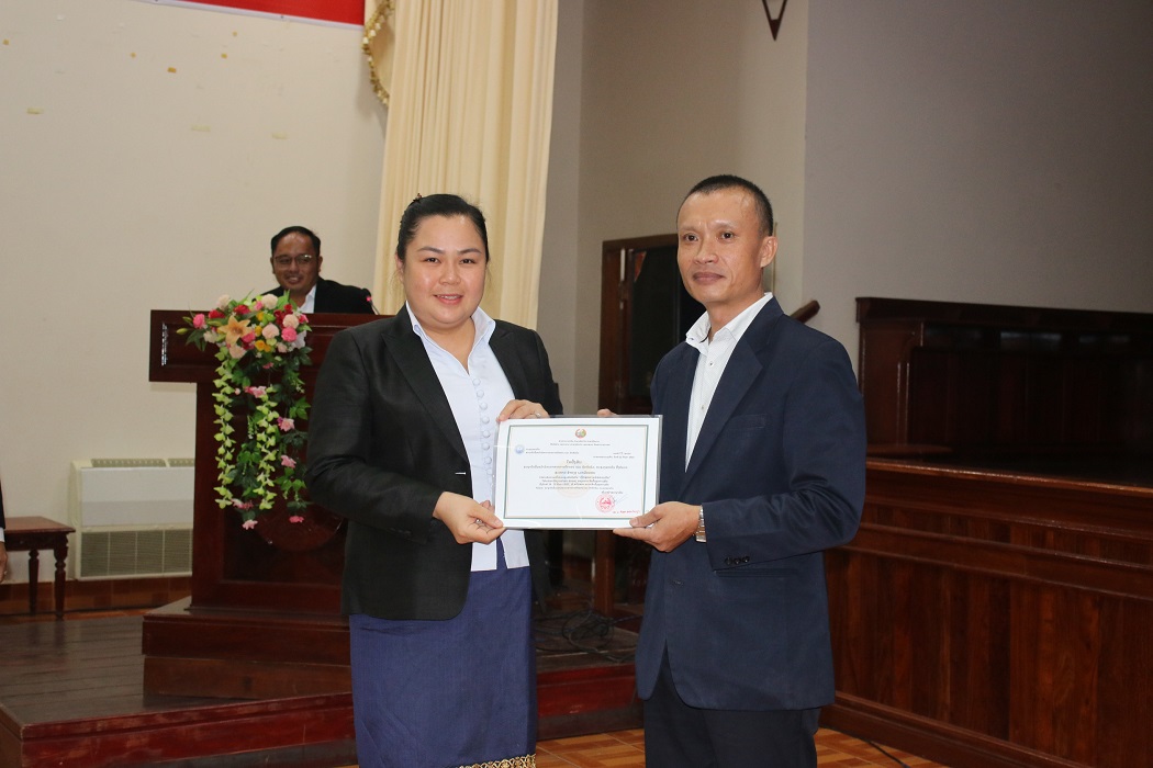 ໃນພິທີດັ່ງກ່າວໄດ້ຮັບຟັງຄຳເຫັນໂອ້ລົມ ຂອງສະຫາຍ ວຽນທອງ ສິງຄຳພັນ ກຳມະການຄະນະພັກ ຫົວໜ້າກົມຈັດຕັ້ງພະນັກງານ ໂດຍສະຫາຍໄດ້ຮຽກຮ້ອງມາຍັງບັນດາສະຫາຍທີ່ເຂົ້້າຮ່ວມຝຶກອົບຮົມໃນຄັ້ງນີ້ຈົ່ງນຳເອົາຄວາມຮູ້ປະສົບການຕົວຈິງທີ່ຜ່ານມາສົບທຽບກັບທິດສະດີ ພ້ອມນຳເອົາບົດຮຽນ ແລະ ປະສົບການອັນໃໝ່ ເພື່ອນຳໄປໝູນໃຊ້ໃນວຽກງານຕົວຈິງໃຫ້ບັນລຸຜົນ. ໃນຕອນທ້າຍຂອງພິທີ ສະຫາຍ ສະຫວ່າງ ໄຊຍະວົງ ຮອງຫົວໜ້າສະຖາບັນຄົ້ນຄວ້າວິທະຍາສາດການປົກຄອງ ແລະ ຝຶກອົບຮົມ, ກະຊວງພາຍໃນ ໄດ້ໃຫ້ມອບໃບຢັ້ງຢືນໃຫ້ແກ່ນັກສຳມະນາກອນ ຈຳນວນ 30 ສະຫາຍ, ຍິງ 11 ສະຫາຍ.