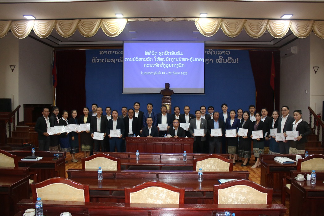ໃນລະຫວ່າງວັນທີ 18-22 ກັນຍາ 2023 ຄະນະຈັດຕັ້ງສູນກາງພັກ ໄດ້ຈັດຊຸດຝຶກອົບຮົມການບໍລິການລັດໃຫ້ພະນັກງານນຳພາ-ຄຸ້ມຄອງ ໂດຍການເປັນປະທານຂອງສະຫາຍ ວຽນທອງ ສິງຄຳພັນ ກຳມະການຄະນະພັກ ຫົວໜ້າກົມຈັດຕັ້ງພະນັກງານ, ມີວິທະຍາກອນທີ່ມາຈາກສະຖາບັນຄົ້ນຄວ້າວິທະຍາສາດການປົກຄອງ ແລະ ຝຶກອົບຮົມ ກະຊວງພາຍໃນ, ມີສຳມະນາກອນທີ່ມີຕຳແໜ່ງຮອງຫົວໜ້າກົມ, ຫົວໜ້າພະແນກ, ຮອງຫົວໜ້າພະແນກ ພາຍໃນຄະນະຈັດຕັ້ງສູນກາງພັກ ແລະ ຄະນະຮັບຜິດຊອບຝຶກອົບຮົມເຂົ້າຮ່ວມທັງໝົດ 46 ສະຫາຍ, ຍິງ 15 ສະຫາຍ.