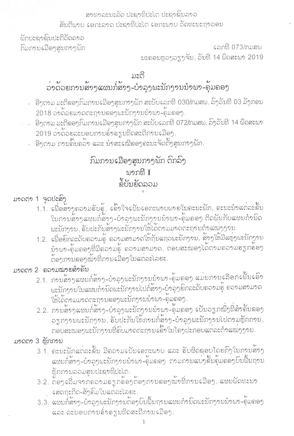 ມະຕິ ເລກທີ 073/ກມສພ, ລົງວັນທີ 14 ພຶດສະພາ 2019 ວ່າດ້ວຍການສ້າງແຜນກໍ່ສ້າງ-ບຳລຸງພະນັກງານນຳພາ-ຄຸ້ມຄອງ
