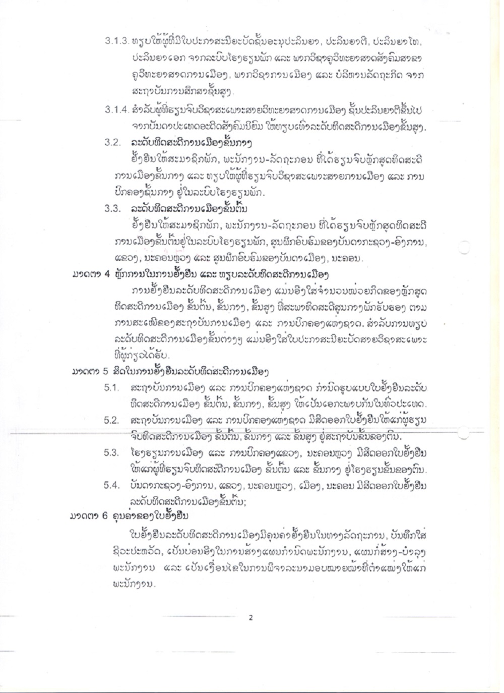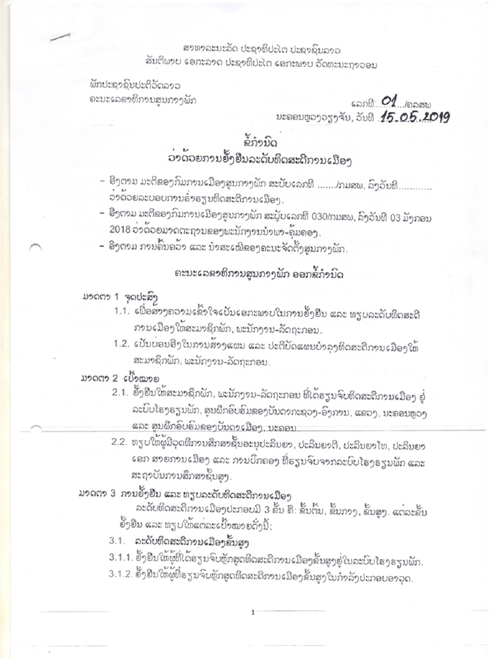 ຂໍ້ກຳນົດ ເລກທີ 01/ຄລສພ ລົງວັນທີ 15 ພຶດສະພາ 2019 ວ່າດ້ວຍການຢັ້ງຢືນລະດັບທິດສະດີການເມືອງ