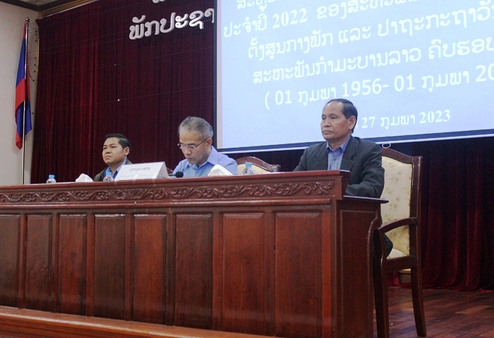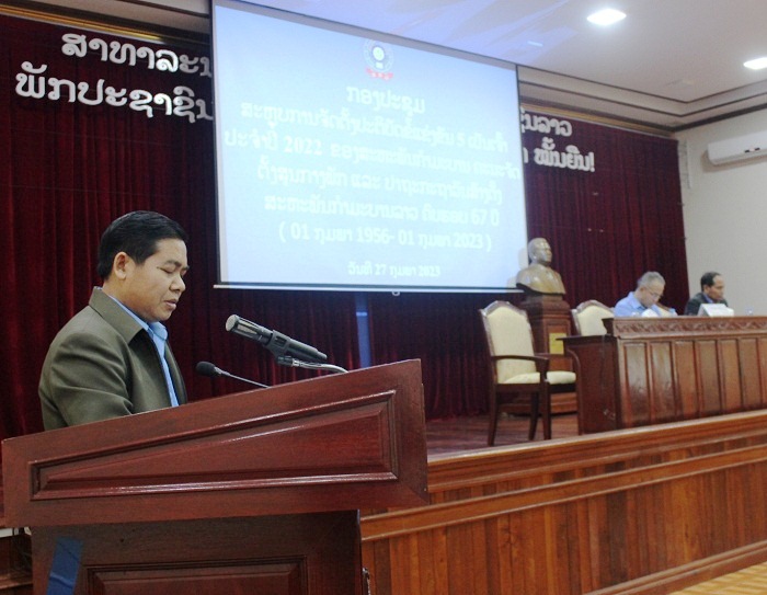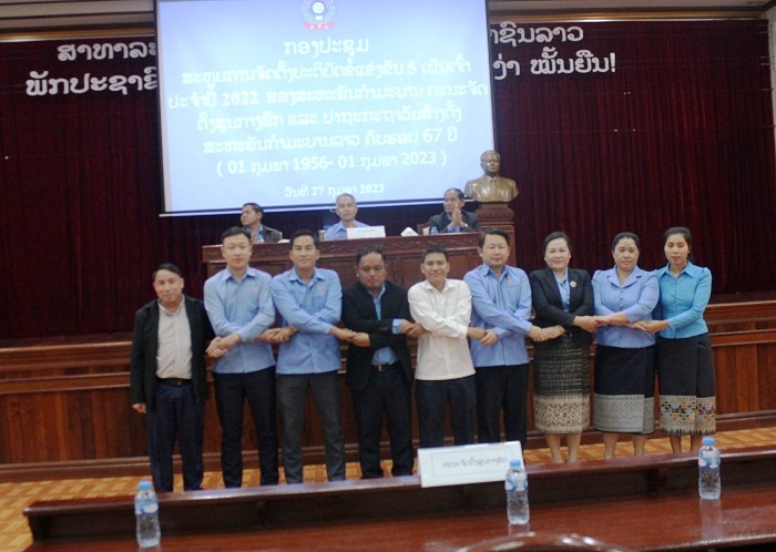 ວັນທີ 27 ກຸມພາ 2023 ທີ່ສະໂມສອນ ຄະນະຈັດຕັ້ງສູນກາງພັກ ໄດ້ຈັດກອງປະຊຸມສະຫຼຸບຕີລາຄາການຈັດຕັ້ງປະຕິບັດເນື້ອໃນຂໍ້ແຂ່ງຂັນ 5 ເປັນເຈົ້າ ປີ 2022 ແລະ ທິດທາງແຜນການປະຈໍາ ປີ 2023 ຂອງສະຫະພັນກຳມະບານ ຄະນະຈັດຕັ້ງສູນກາງພັກ ແລະ ປະຖະກະຖາ ວັນສ້າງຕັ້ງສະຫະພັນກຳມະບານ ຄົບຮອບ 67 ປີ (1 ກຸມພາ 1956 - 1 ກຸມພາ 2023) ໂດຍການເປັນປະທານຂອງສະຫາຍ ຄູນເພັງ ໄຊສະຫວາດ ປະທານສະຫະພັນກຳມະບານ ຄະນະຈັດຕັ້ງສູນກາງພັກ, ຮອງຫົວໜ້າກົມກໍ່ສ້າງພັກ. ເປັນກຽດເຂົ້າຮ່ວມຂອງສະຫາຍ ທອງຈັນ ໂຂງພູມຄຳ ຄະນະປະຈຳພັກ, ຮອງຫົວໜ້າຄະນະຈັດຕັ້ງສູນກາງພັກ, ສະຫາຍ ວິໄລ ວົງຂະເສີມ ຮອງປະທານຄະນະບໍລິຫານງານສູນກາງສະຫະພັນກຳມະບານລາວ, ສະຫາຍ ຄຳປ່ຽນ ແກ້ວສໍລະສິງ ຄະນະພັກ ຫົວໜ້າກົມກົງຈັກການຈັດຕັ້ງ ແລະ ກົດລະບຽບພັກ ຜູ້ຊ່ວຍຊີ້ນຳສະຫະພັນກຳມະບານ ຄະນະຈັດຕັ້ງສູນກາງພັກ, ມີບັນດາຄະນະບໍລິຫານງານສະຫະພັນກຳມະບານ ຄະນະຈັດຕັ້ງສູນກາງພັກ, ສະມາຊິກສະຫະພັນ ກຳມະບານຮາກຖານແຕ່ລະໜ່ວຍທີ່ຂຶ້ນກັບຄະນະຈັດຕັ້ງສູນກາງພັກເຂົ້າຮ່ວມທັງໝົດ 153 ສະຫາຍ, ຍິງ 64 ສະຫາຍ.